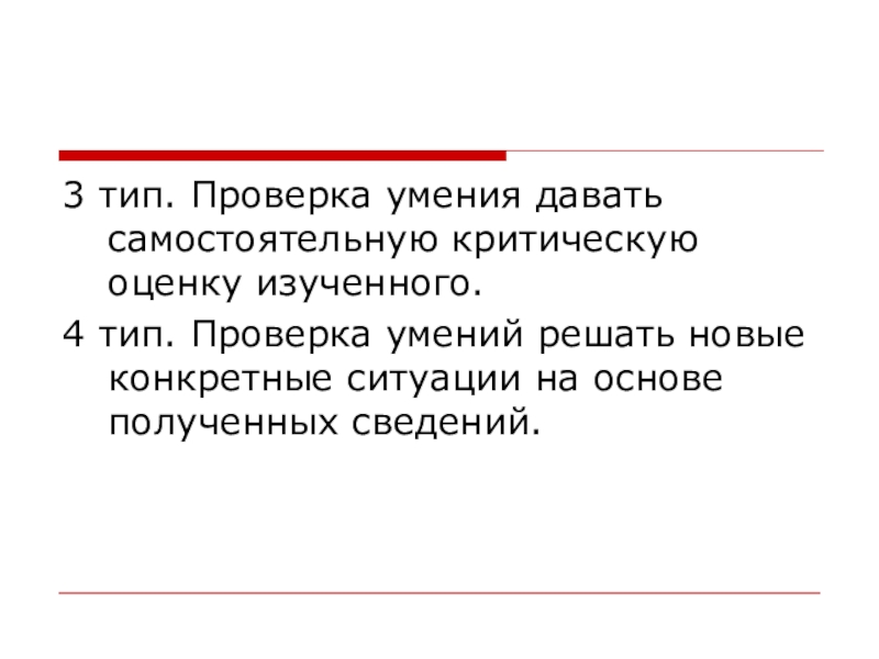 3 тип. Проверка умения давать самостоятельную критическую оценку изученного.4 тип. Проверка умений решать новые конкретные ситуации на