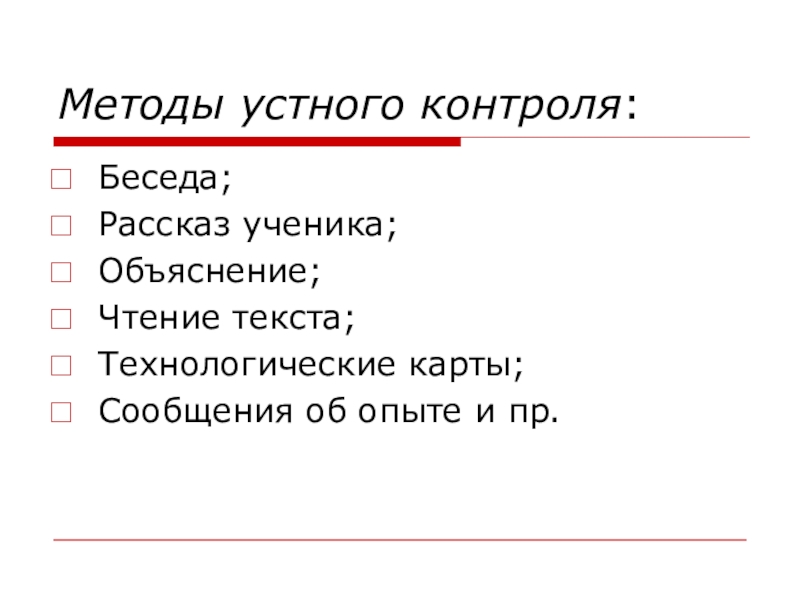 Методы устного контроля:Беседа;Рассказ ученика;Объяснение;Чтение текста;Технологические карты;Сообщения об опыте и пр.