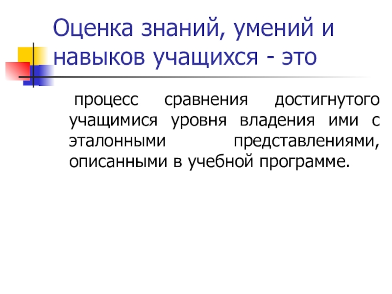 Оценка знаний, умений и навыков учащихся - это	процесс сравнения достигнутого учащимися уровня владения ими с эталонными представлениями,