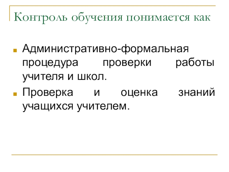 Контроль обучения понимается какАдминистративно-формальная процедура проверки работы учителя и школ.Проверка и оценка знаний учащихся учителем.