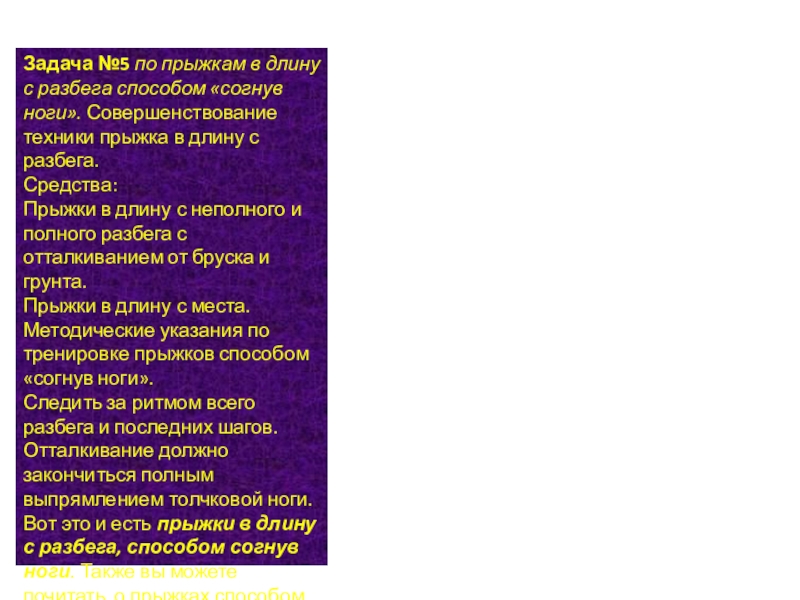 Слайд 6Задача №5 по прыжкам в длину с разбега способом «согнув ноги». Совершенствование техники