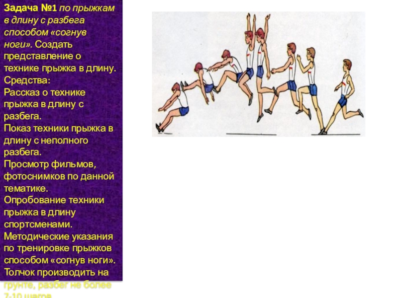 Слайд 2Задача №1 по прыжкам в длину с разбега способом «согнув ноги». Создать представление