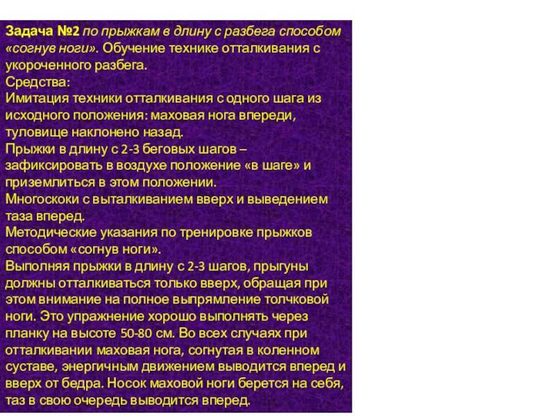 Слайд 3Задача №2 по прыжкам в длину с разбега способом «согнув ноги». Обучение