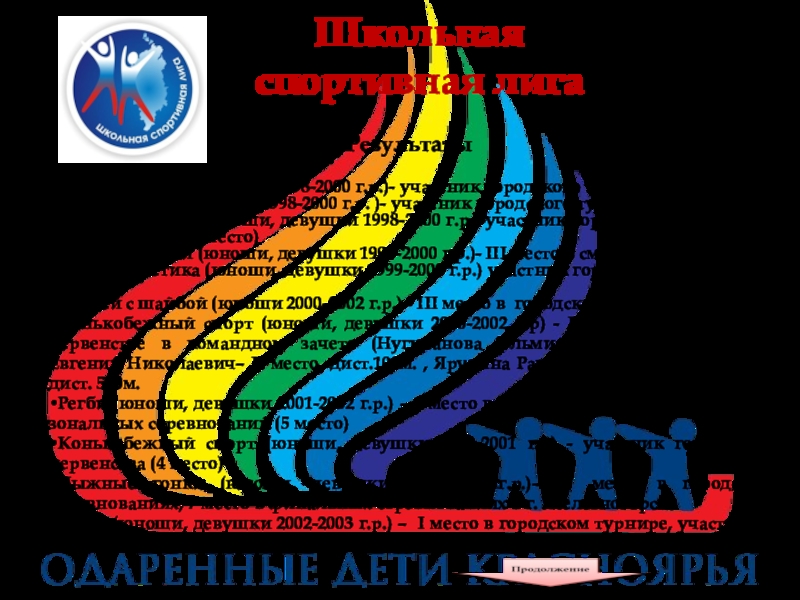 Лыжные гонки (юноши, девушки 1999-2001 г.р.)- I место в городских соревнованиях, 7 место в финальных соревнованиях в г. Железногорске