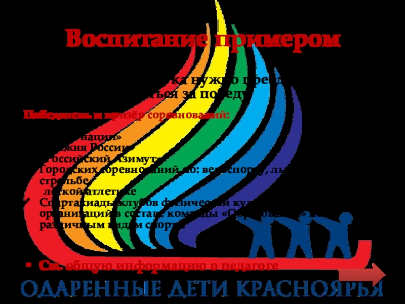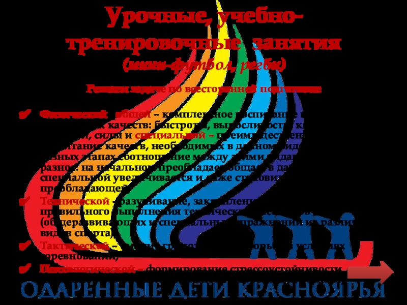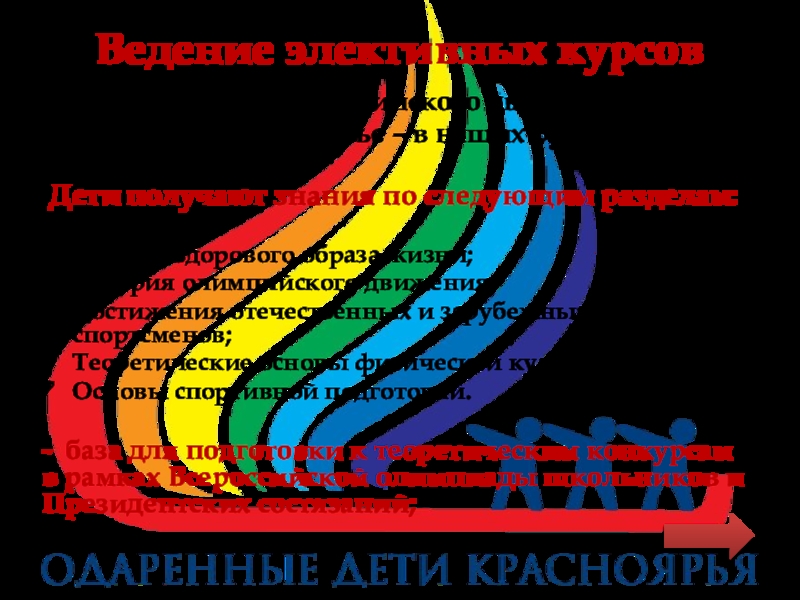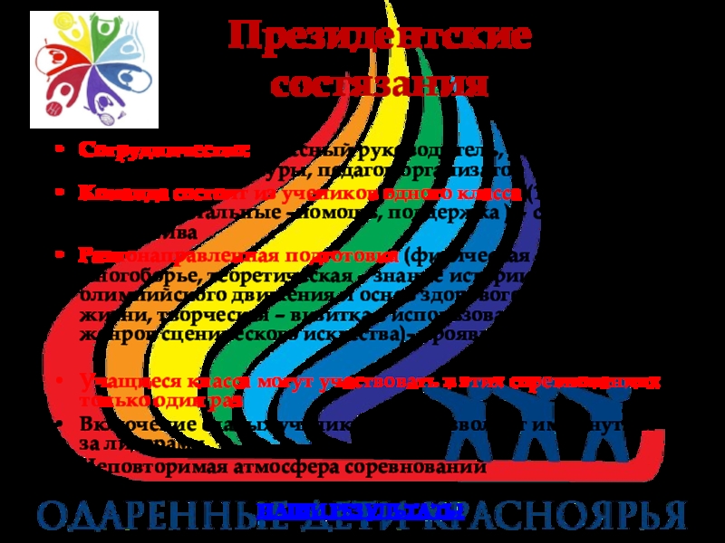 Разнонаправленная подготовка (физическая – многоборье, теоретическая – знание истории олимпийского движения и основ здорового образа жизни, творческая – визитка с использованием всех жанров сценического искусства)- проявить себя могут все