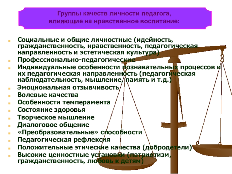 Группы качеств личности педагога, влияющие на нравственное воспитание: