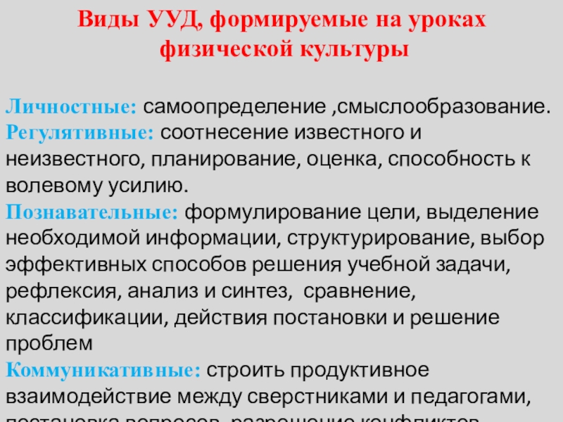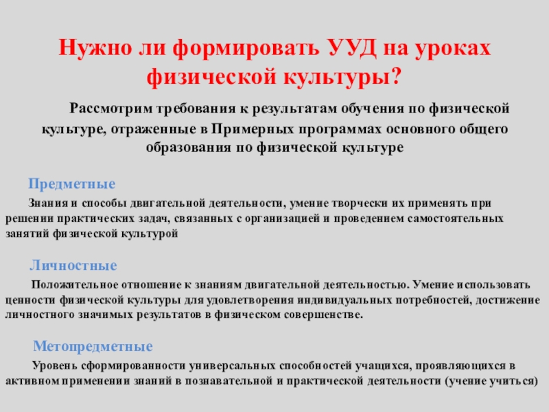 Метапредметные результаты обеспечиваются через формирование УУД. Постольку поскольку существует достаточно большое количество видов УУД, то в рамках предмета «Физическая культура» одним учителем невозможно сформировать все УУД.