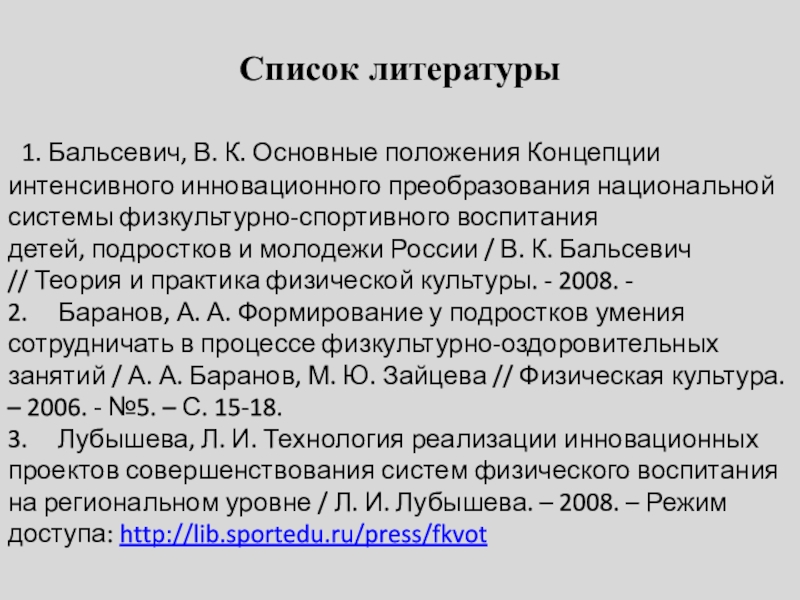 3. Лубышева, Л. И. Технология реализации инновационных проектов совершенствования систем физического воспитания на региональном уровне / Л. И. Лубышева. – 2008. – Режим доступа: http://lib.sportedu.ru/press/fkvot