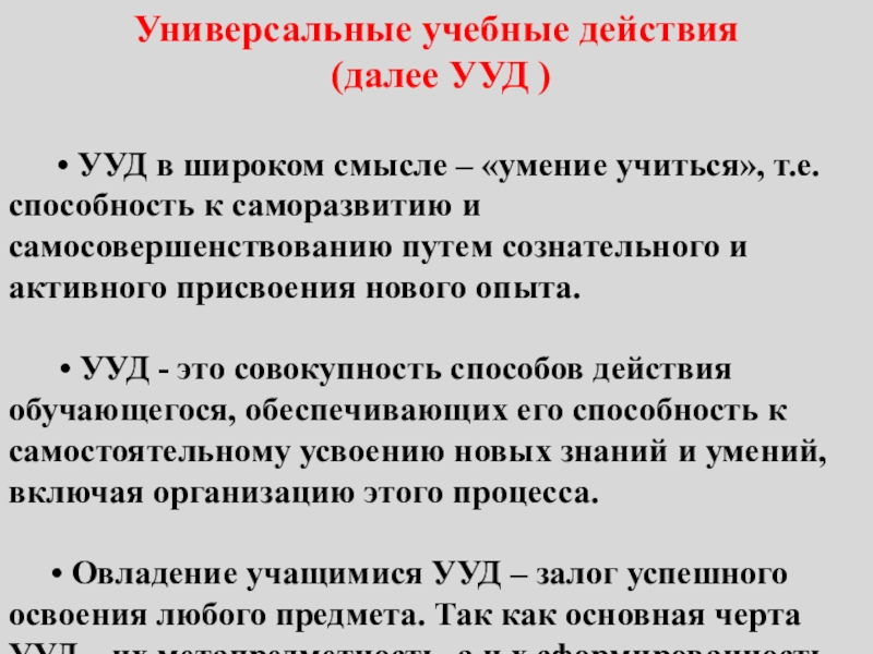 • УУД - это совокупность способов действия обучающегося, обеспечивающих его способность к самостоятельному усвоению новых знаний и умений, включая организацию этого процесса.