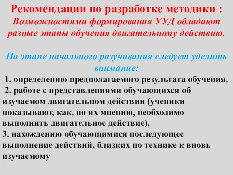 Слайд 14Рекомендации по разработке методики : Возможностями формирования УУД обладают разные этапы