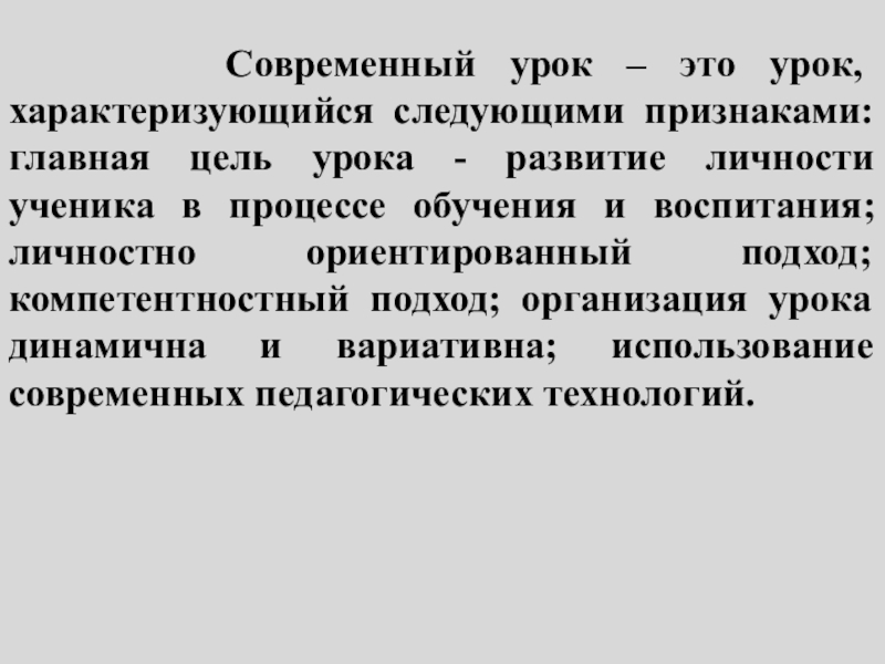 это урок, характеризующийся следующими признаками: главная цель урока - развитие личности ученика в процессе обучения и воспитания; личностно ориентированный подход; компетентностный подход; организация урока динамична и вариативна; использование современных педагогических технологий.