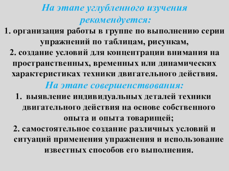 2. создание условий для концентрации внимания на пространственных, временных или динамических характеристиках техники двигательного действия.