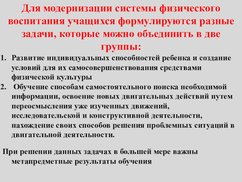 Слайд 8Для модернизации системы физического воспитания учащихся формулируются разные задачи, которые можно