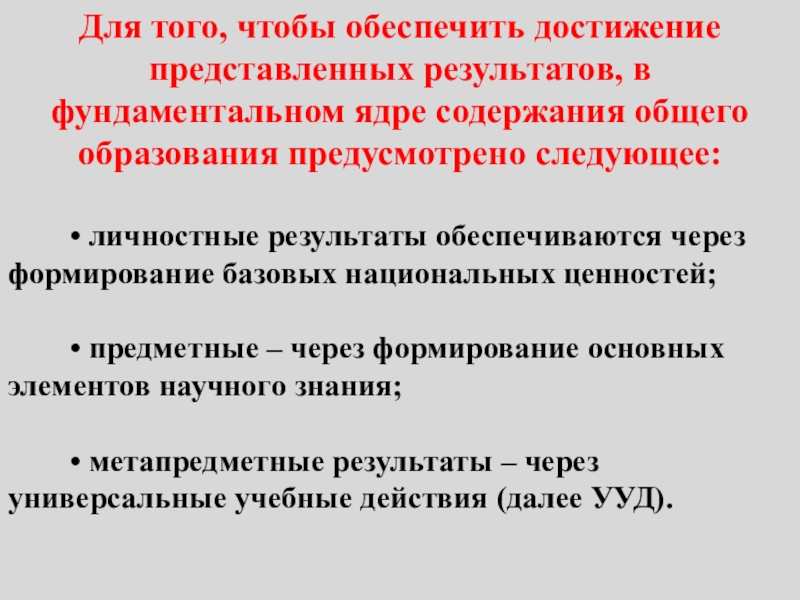Слайд 5Для того, чтобы обеспечить достижение представленных результатов, в фундаментальном ядре содержания