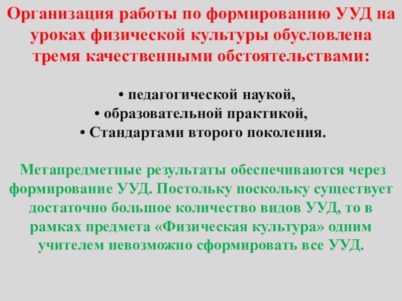 Слайд 10Организация работы по формированию УУД на уроках физической культуры обусловлена тремя