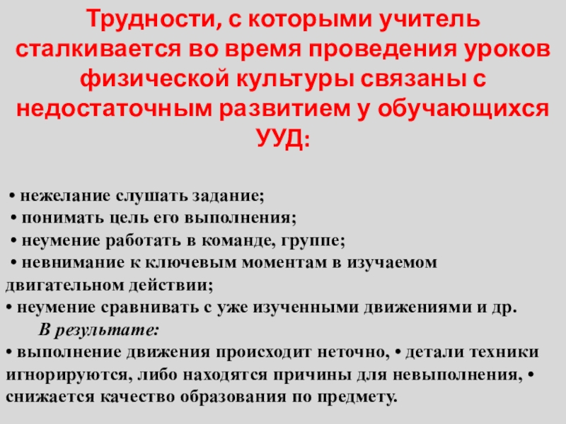 • выполнение движения происходит неточно, • детали техники игнорируются, либо находятся причины для невыполнения, • снижается качество образования по предмету.
