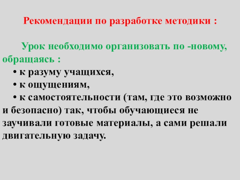 • к самостоятельности (там, где это возможно и безопасно) так, чтобы обучающиеся не заучивали готовые материалы, а сами решали двигательную задачу.