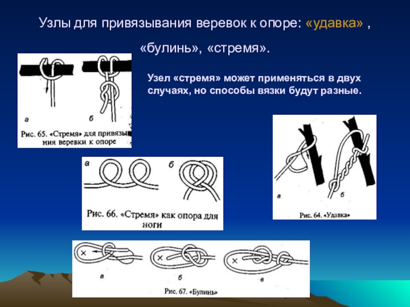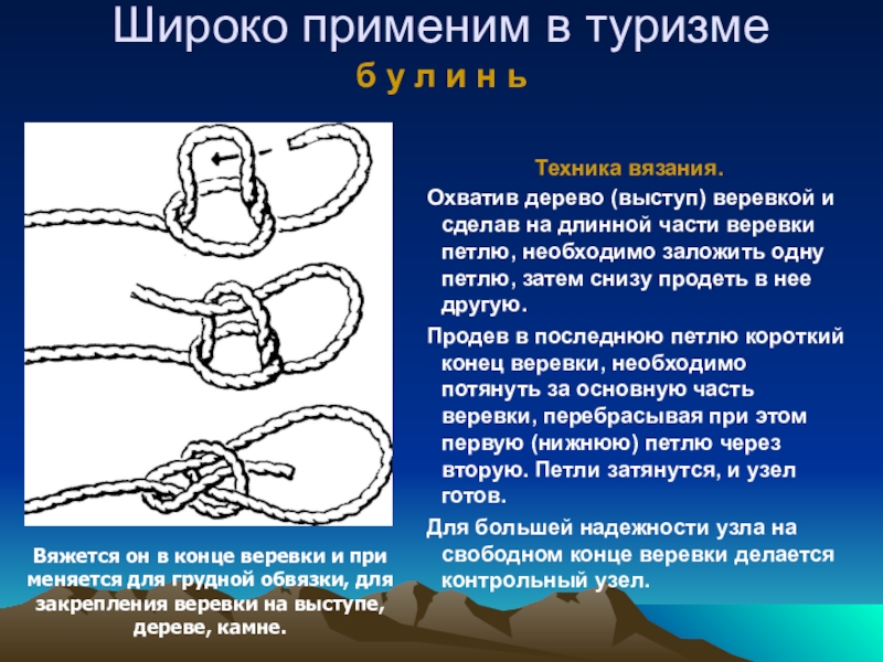 Вяжется он в конце веревки и применяется для грудной обвязки, для закрепления веревки на выступе, дереве, камне.
