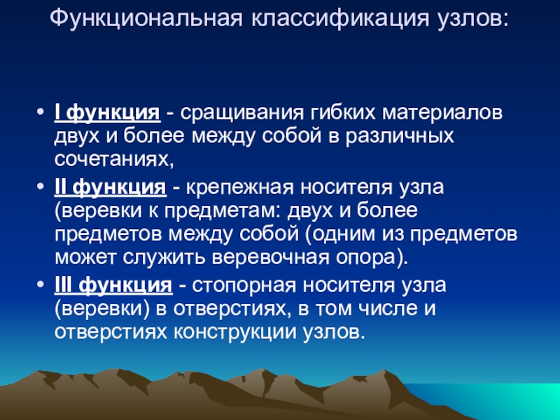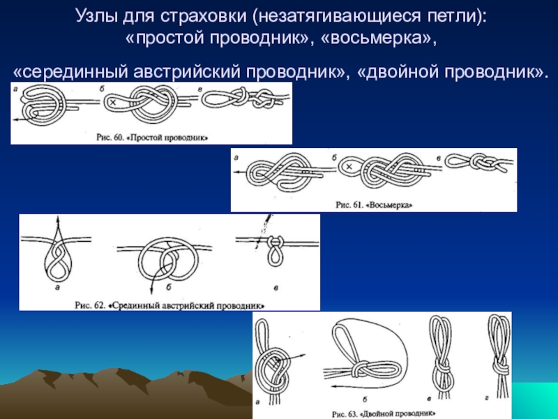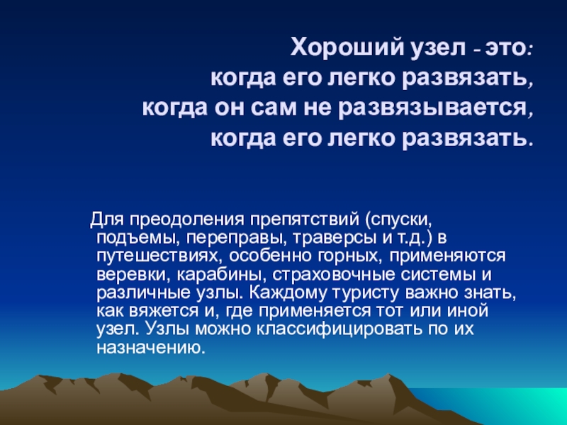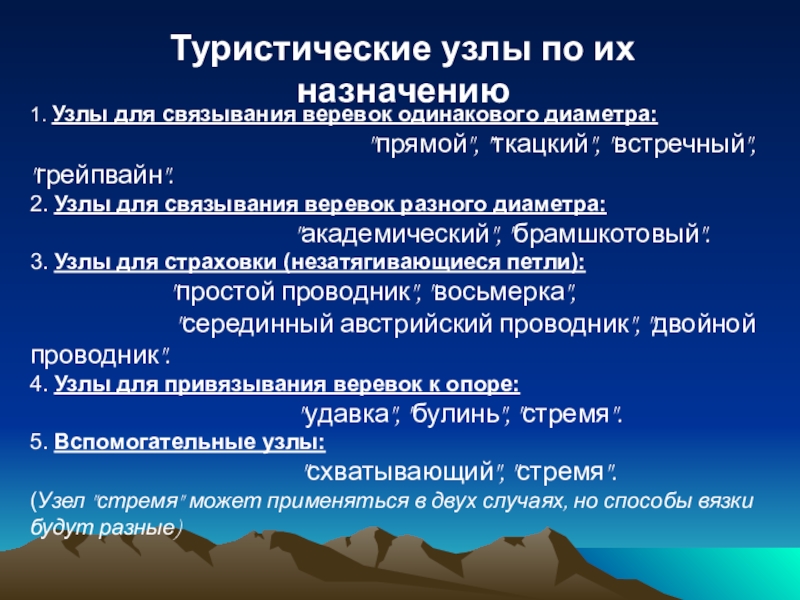 Для преодоления препятствий (спуски, подъемы, переправы, траверсы и т.д.) в путешествиях, особенно горных, применяются веревки, карабины, страховочные системы и различные узлы. Каждому туристу важно знать, как вяжется и, где применяется тот или иной узел. Узлы можно классифицировать по их назначению.