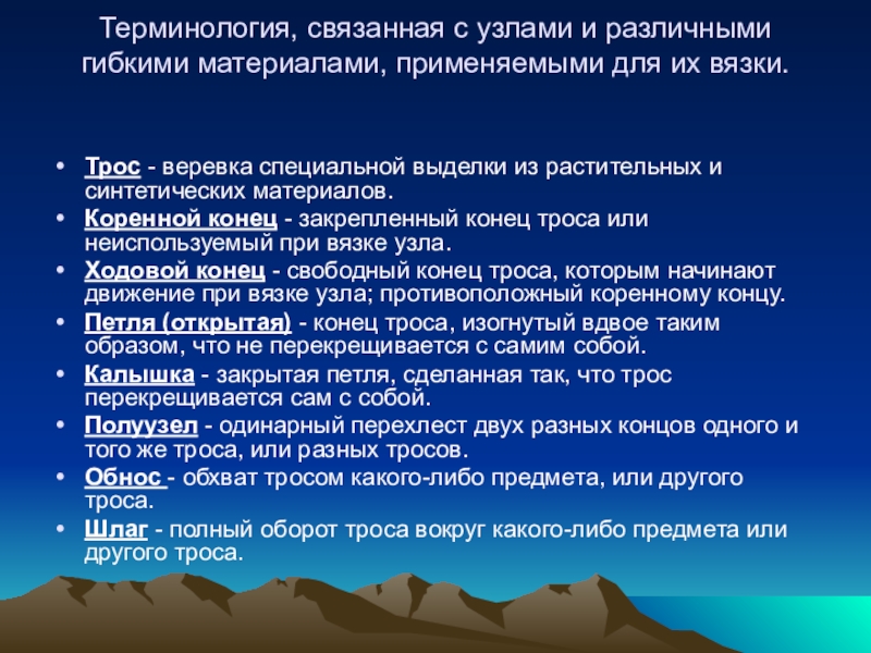 Коренной конец - закрепленный конец троса или неиспользуемый при вязке узла.
