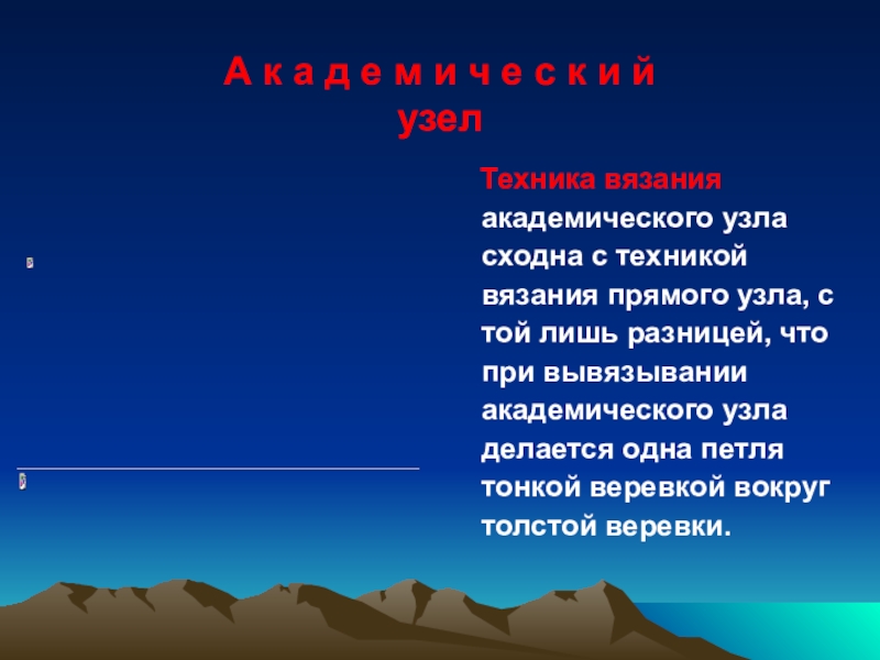 Техника вязания академического узла сходна с техникой вязания прямого узла, c той лишь разницей, что при вывязывании академического узла делается одна петля тонкой веревкой вокруг толстой веревки.