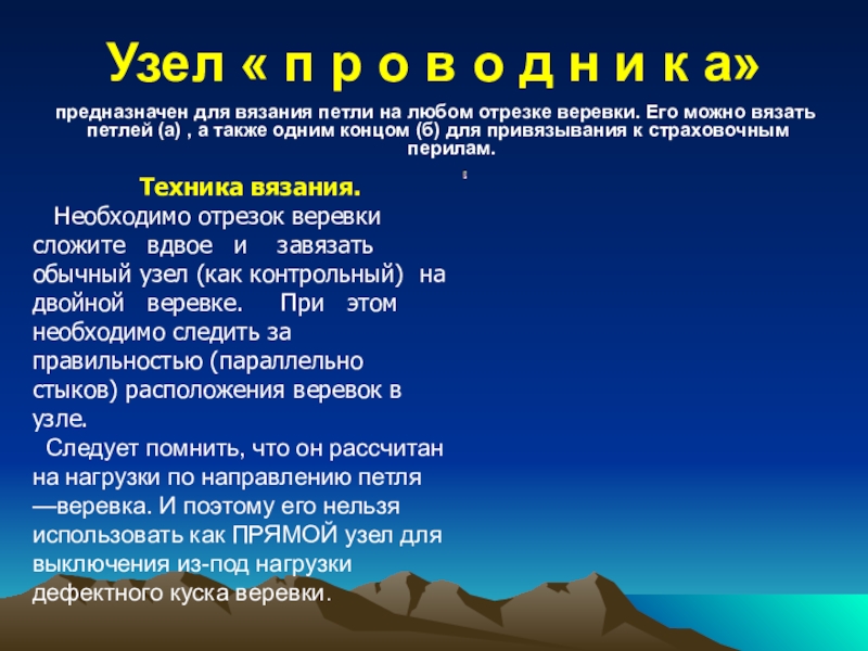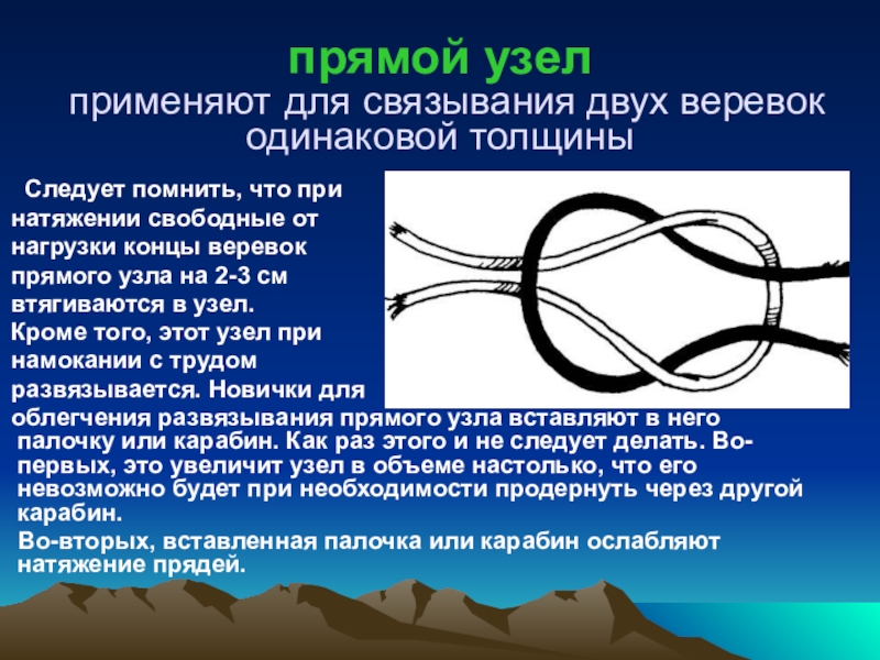Следует помнить, что он рассчитан на нагрузки по направлению петля —веревка. И поэтому его нельзя использовать как ПРЯМОЙ узел для выключения из-под нагрузки дефектного куска веревки.