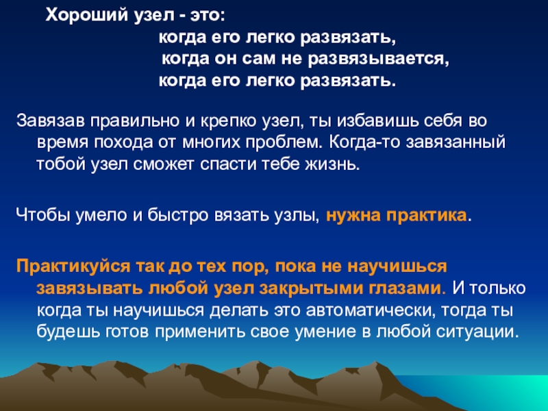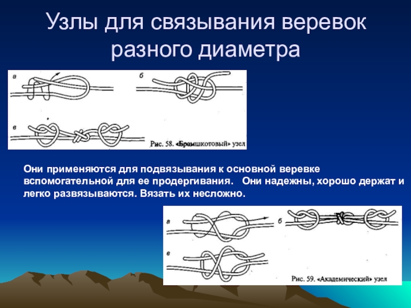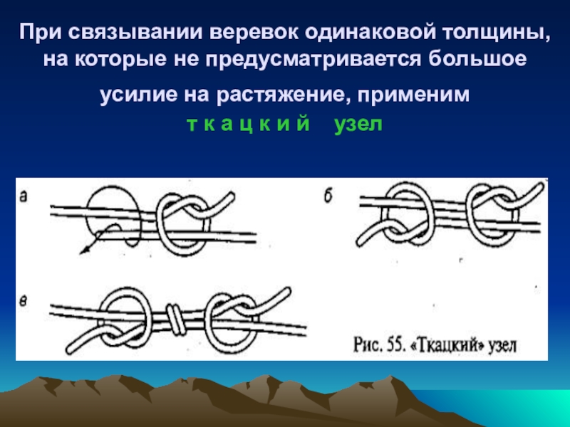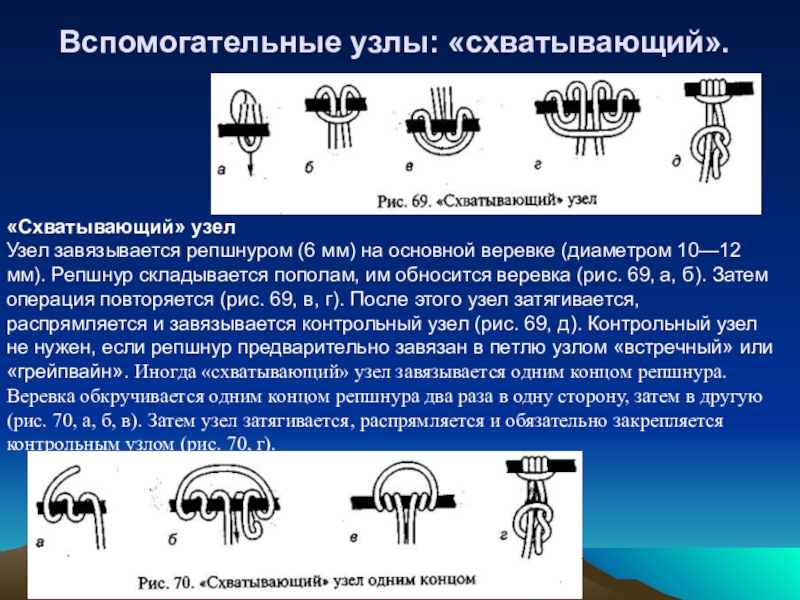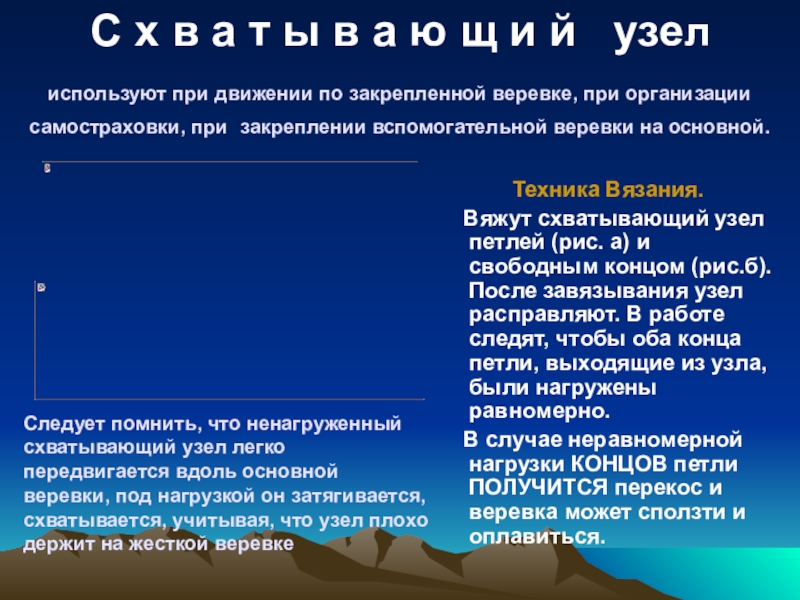 Следует помнить, что ненагруженный схватывающий узел легко передвигается вдоль основной веревки, под нагрузкой он затягивается, схватывается, учитывая, что узел плохо держит на жесткой веревке