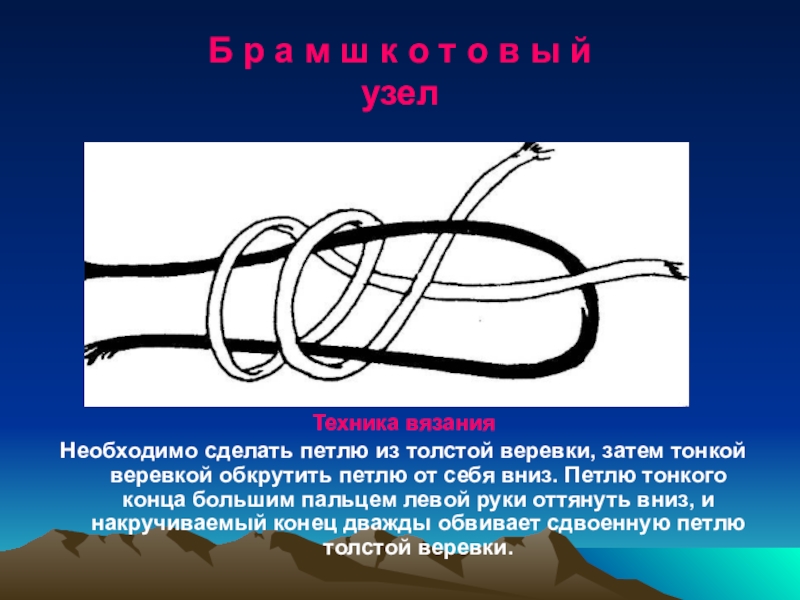 Необходимо сделать петлю из толстой веревки, затем тонкой веревкой обкрутить петлю от себя вниз. Петлю тонкого конца большим пальцем левой руки оттянуть вниз, и накручиваемый конец дважды обвивает сдвоенную петлю толстой веревки.