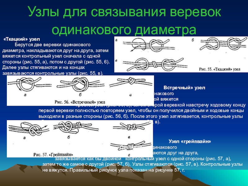 Узел «грейпвайн» Две веревки одинакового диаметра накладываются друг на друга, завязывается как бы двойной контрольный узел с одной стороны (рис. 57, а), затем то же самое с другой (рис. 57, б). Узлы стягиваются (рис. 57, в). Контрольные узлы не вяжутся. Правильный рисунок узла показан на рисунке 57, г.