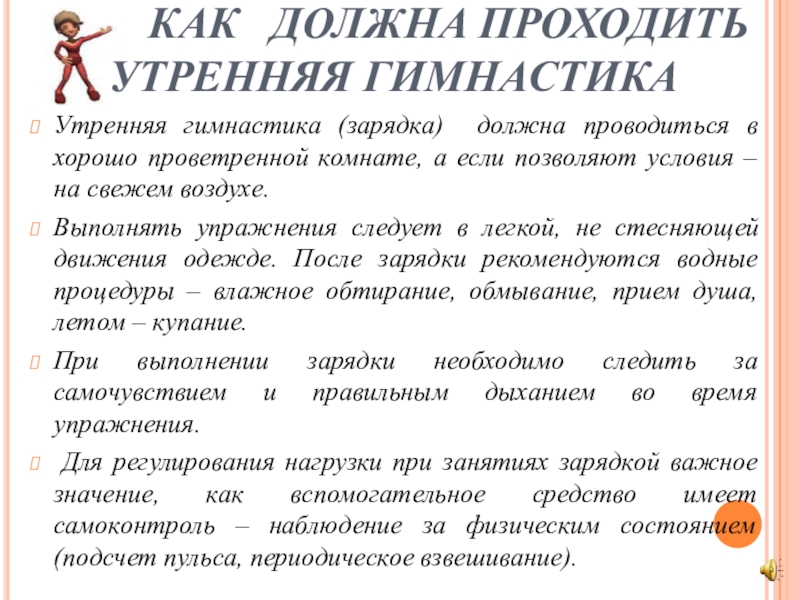 Утренняя гимнастика (зарядка) должна проводиться в хорошо проветренной комнате, а если позволяют условия – на свежем воздухе.