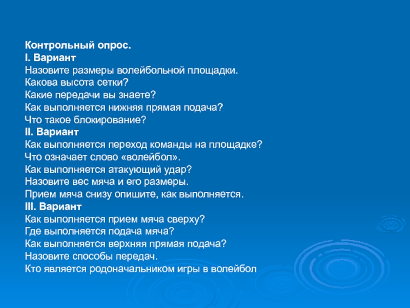 Контрольный опрос.I. ВариантНазовите размеры волейбольной площадки.Какова высота сетки?Какие передачи вы знаете?Как выполняется нижняя прямая подача?Что такое блокирование?II.