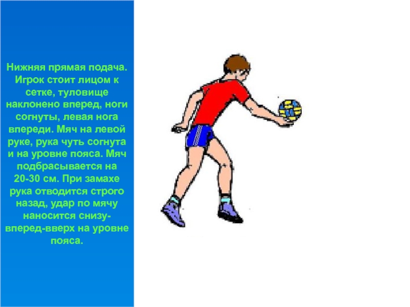 Нижняя прямая подача. Игрок стоит лицом к сетке, туловище наклонено вперед, ноги согнуты, левая нога впереди. Мяч