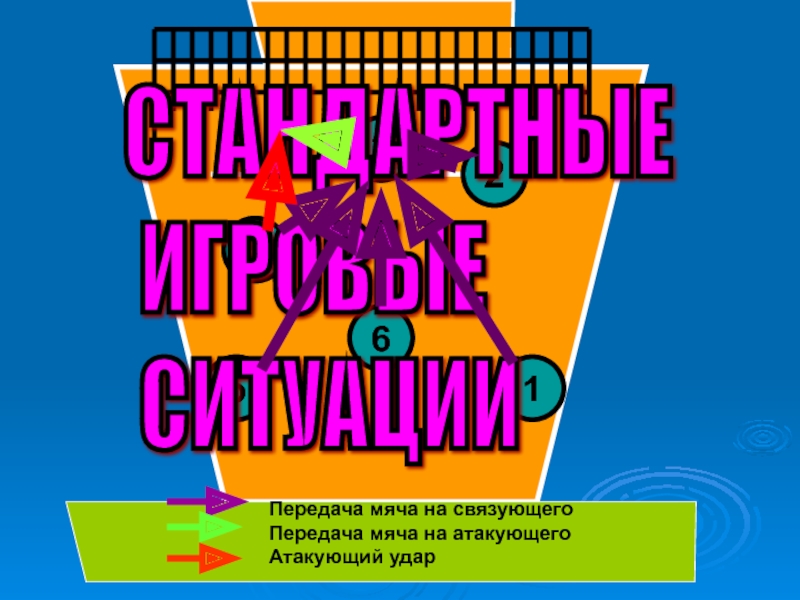 345621СТАНДАРТНЫЕ   ИГРОВЫЕ   СИТУАЦИИПередача мяча на связующегоПередача мяча на атакующегоАтакующий удар