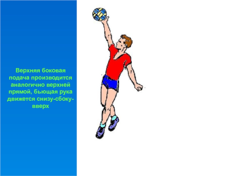 Слайд 37Верхняя боковая подача производится аналогично верхней прямой, бьющая рука движется снизу-сбоку-вверх