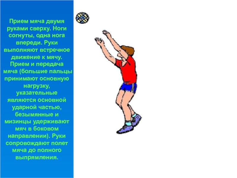 развернуты немного наружу, кисти сомкнуты и опущены вниз. Прием мяча производится на нижнюю часть предплечий, руки в локтевых суставах прямые (не сгибать!). Нет большого встречного движения, руки чуть-чуть приближаются к мячу. Передача мяча осуществляется за счет небольшого разгибания ног и направляющего движения руками.