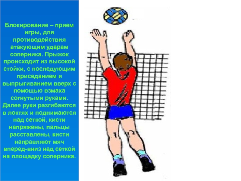 Слайд 41Блокирование – прием игры, для противодействия атакующим ударам соперника. Прыжок происходит