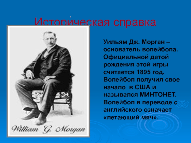 Историческая справка Уильям Дж. Морган – основатель волейбола. Официальной датой рождения этой игры считается 1895 год.