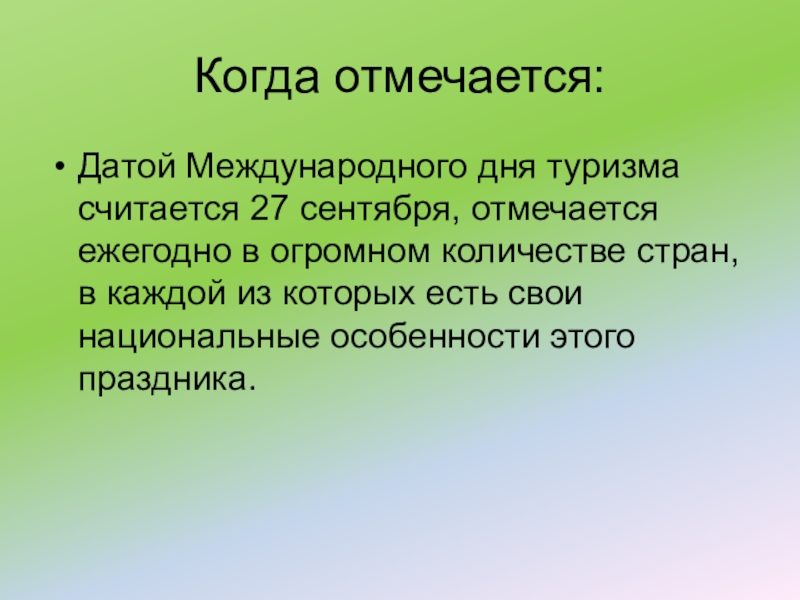Когда отмечается:Датой Международного дня туризма считается 27 сентября, отмечается ежегодно в огромном количестве стран, в каждой из