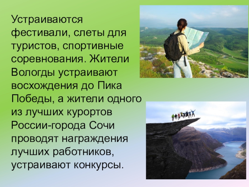 Слайд 7Устраиваются фестивали, слеты для туристов, спортивные соревнования. Жители Вологды устраивают восхождения