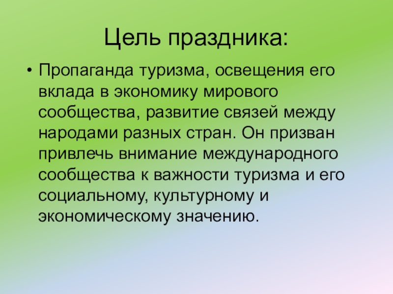Цель праздника:Пропаганда туризма, освещения его вклада в экономику мирового сообщества, развитие связей между народами разных стран. Он