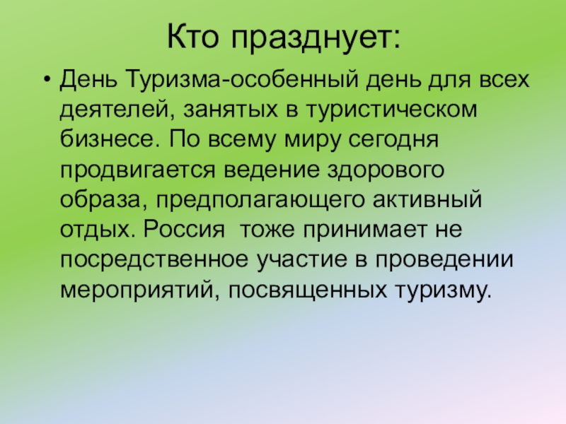 Кто празднует:День Туризма-особенный день для всех деятелей, занятых в туристическом бизнесе. По всему миру сегодня продвигается ведение