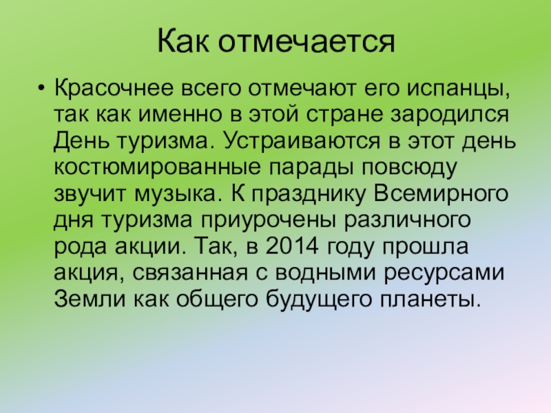 Как отмечаетсяКрасочнее всего отмечают его испанцы, так как именно в этой стране зародился День туризма. Устраиваются в