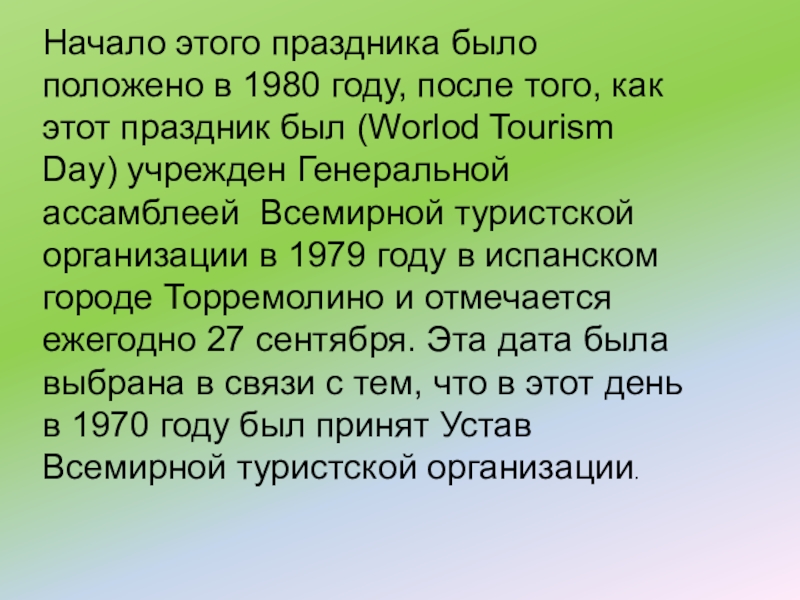 Начало этого праздника было положено в 1980 году, после того, как этот праздник был (Worlod Tourism Day)