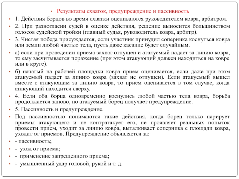 Под пассивностью понимаются такие действия, когда борец только парирует приемы атакующего и не контратакует его, не проявляет реальных попыток провести прием, уходит за линию ковра, выталкивает соперника с площади ковра, уходит от приемов. Предупреждение объявляется за: