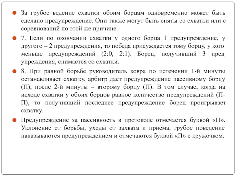 Слайд 9За грубое ведение схватки обоим борцам одновременно может быть сделано предупреждение.