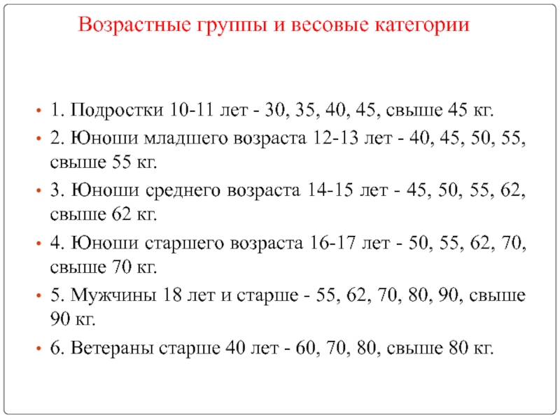 4. Юноши старшего возраста 16-17 лет - 50, 55, 62, 70, свыше 70 кг.