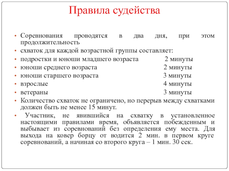 Участник, не явившийся на схватку в установленное настоящими правилами время, объявляется побежденным и выбывает из соревнований без определения ему места. Для выхода на ковер борцу от водится 2 мин. в первом круге соревнований, а начиная со второго круга – 1 мин. 30 сек.