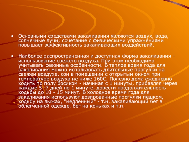Основными средствами закаливания являются воздух, вода, солнечные лучи; сочетание с физическими
