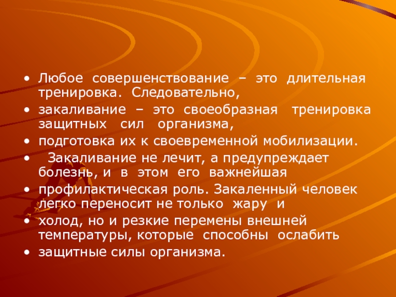 профилактическая роль. Закаленный человек легко переносит не только жару и