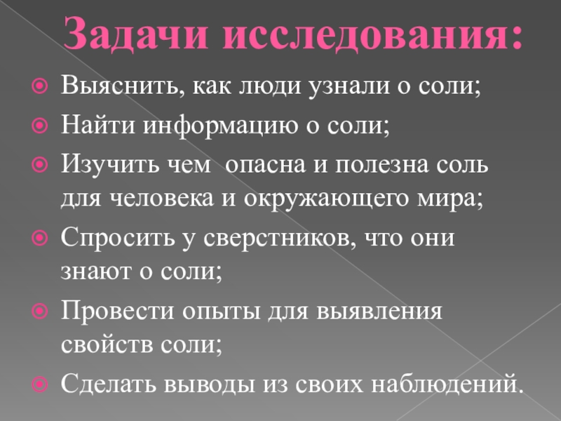 Задачи исследования: Выяснить, как люди узнали о соли; Найти информацию о соли;Изучить чем опасна и полезна соль